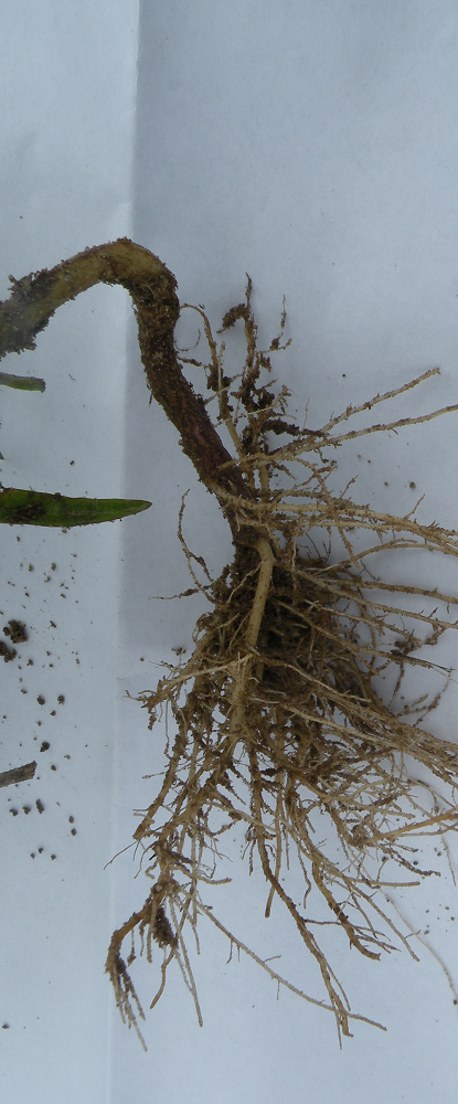 Korzeń silny, palowy z rozgałęzieniami, sięga do 30 cm w głąb ziemi.