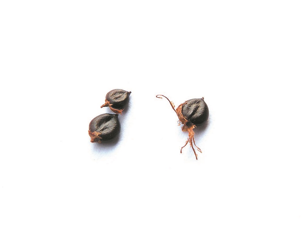 Nasiona jajowate orzechy, czasami spłaszczone, długości około 2 mm i szerokości 1,5 mm, prawie czarne ze słabym połyskiem.