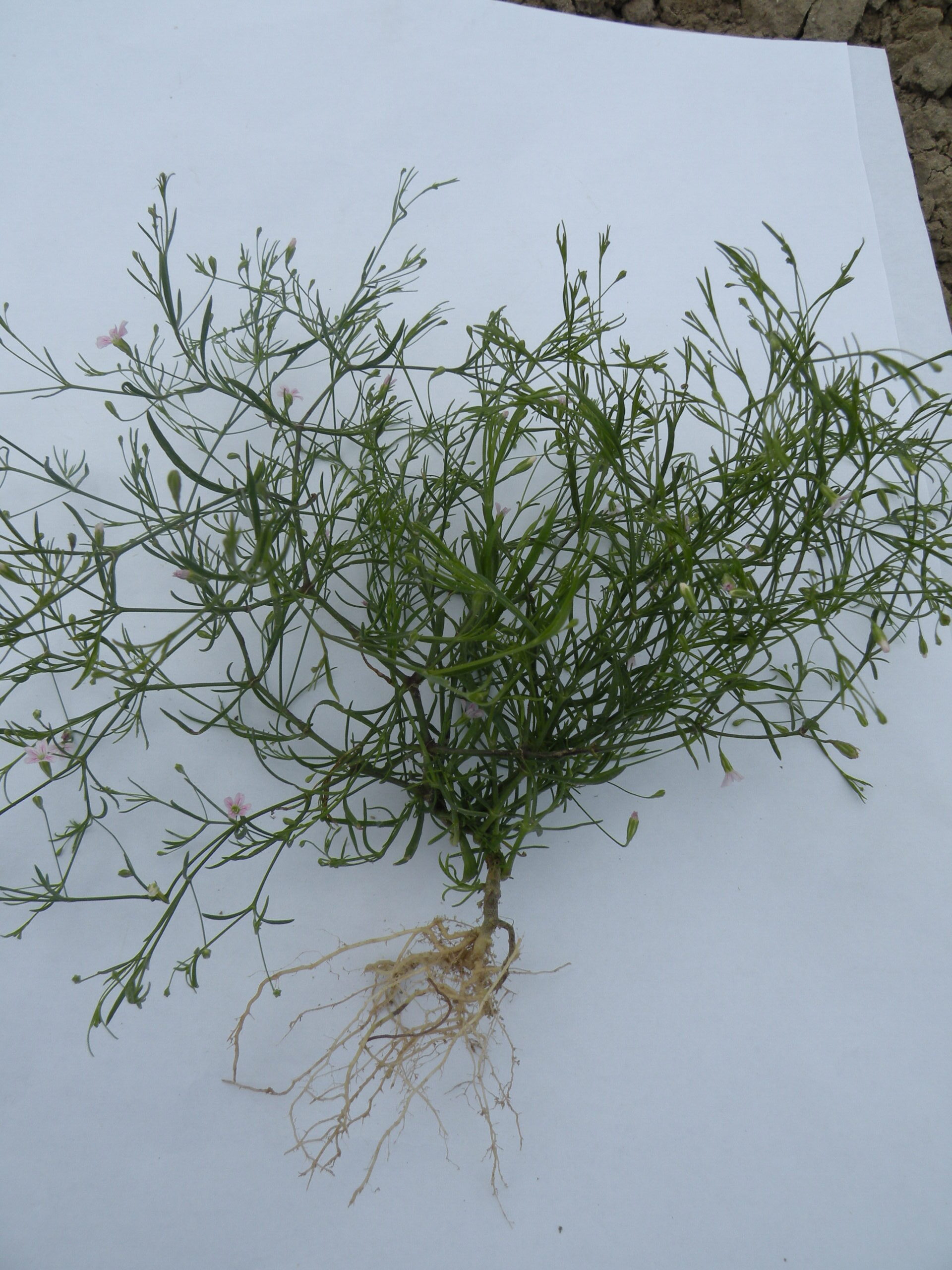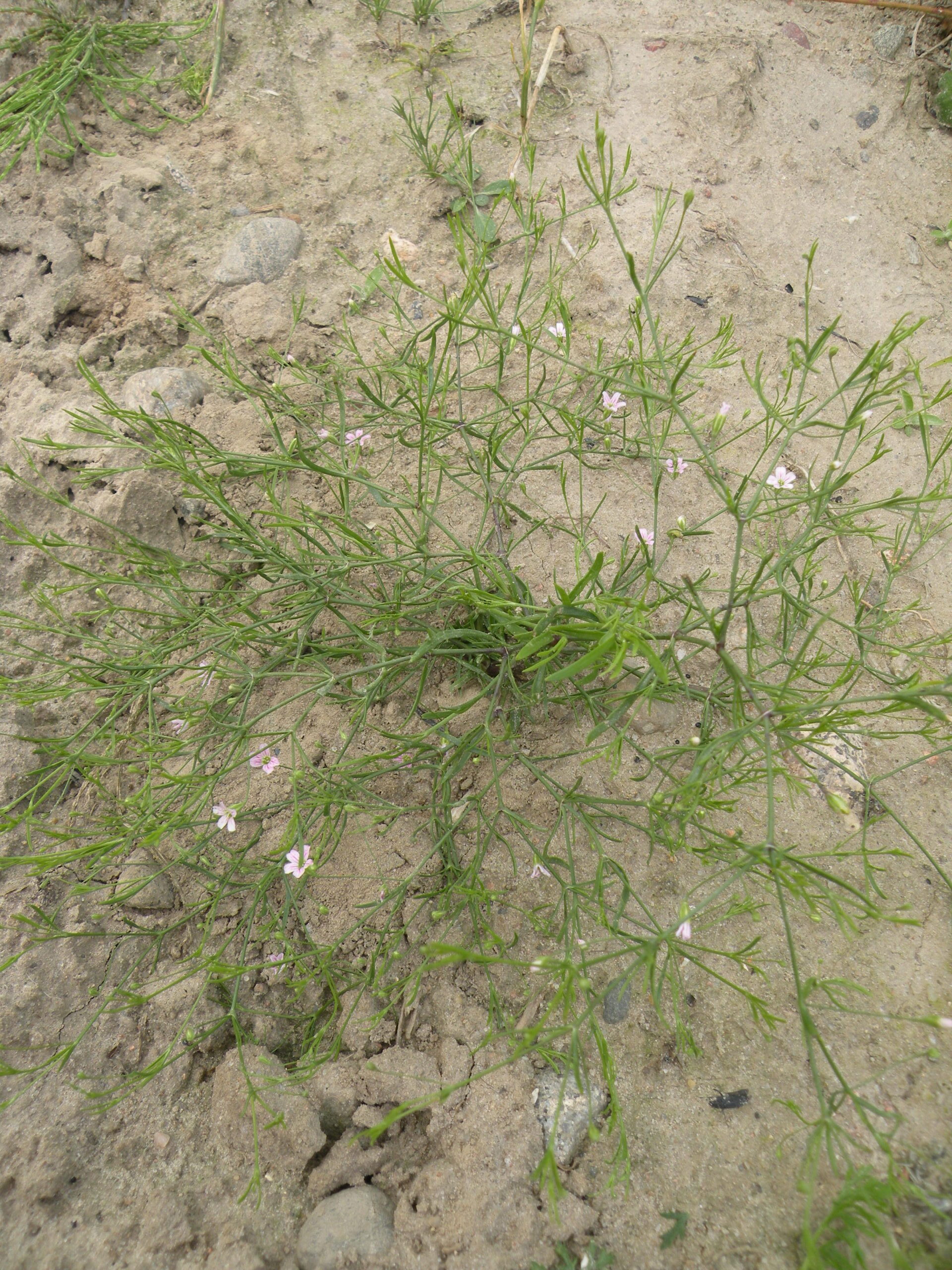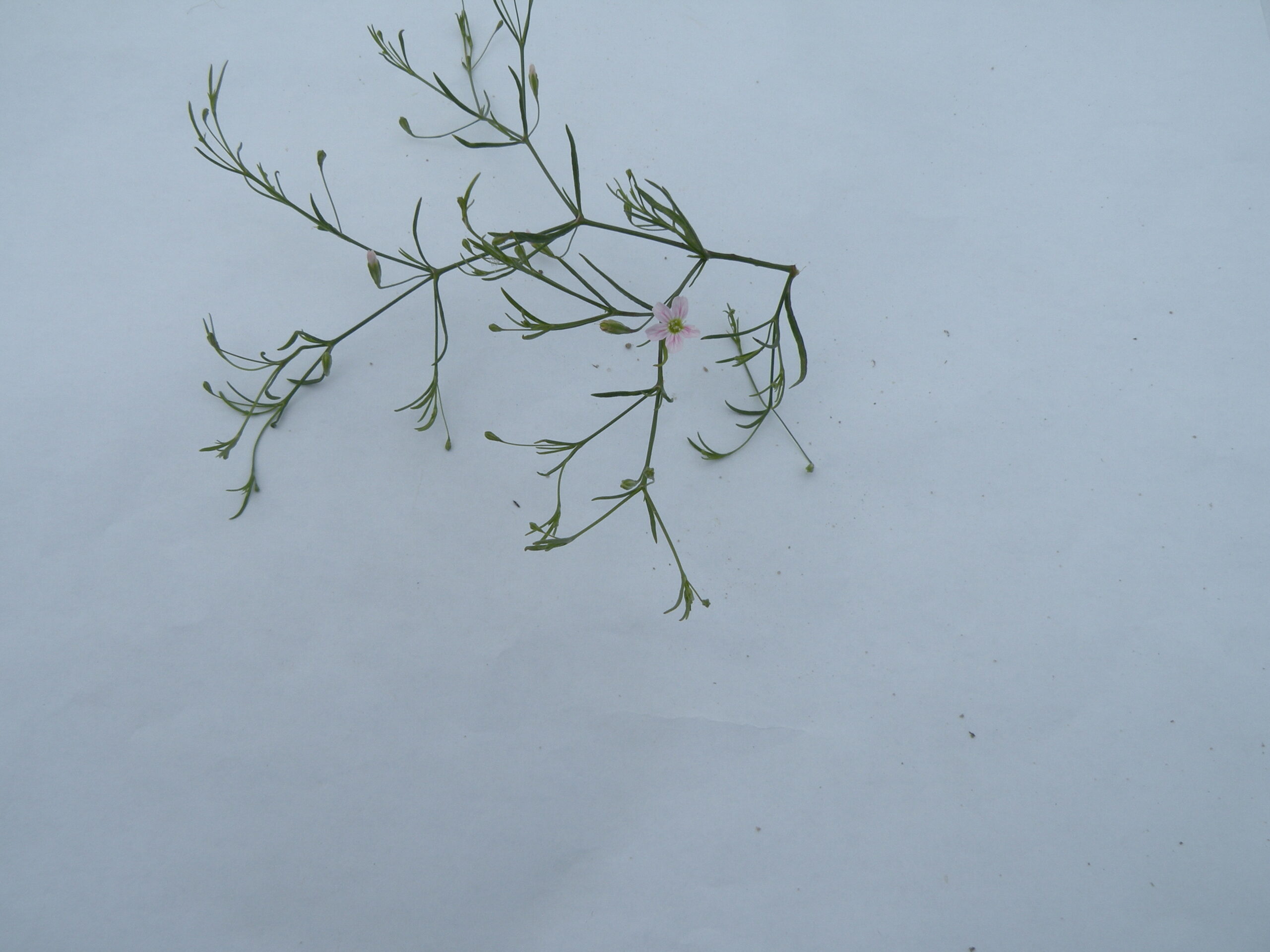 Roślina dorosła – łodyga od dołu rozgałęziona, gruczołowato owłosiona, wiotka. Liście mięsiste, lepkie, z wyraźną bruzdą od dołu. Bardzo wąskie długości (10) 20–30 mm, prawie nitkowate. Razem z przylistkami tworzą mięsiste, lepkie, gruczołowate owłosione okółki. Wzniesione są ku górze.